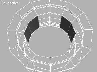 свитка Selection (Выделение). Затем в окне проекции Perspective (Перспектива) выберите три пары внутренних полигонов (рис. 3.18). Для удобства можете включить режимы отображения Wireframe (Каркас) или Edged Faces (Контуры ребер). Для этого щелкните правой кнопкой мыши на названии окна проекции и выберите нужный режим в появившемся контекстном меню.