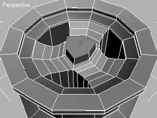 8. Щелкните на кнопке Bevel (Выдавливание со скосом) в свитке Edit Geometry (Редактирование геометрии) и сделайте четыре последовательных выдавливания полигонов внутрь диска с уменьшением (рис. 3.19).9. Не снимая выделения с внутренних полигонов, нажмите клавишу Delete для их удаления.