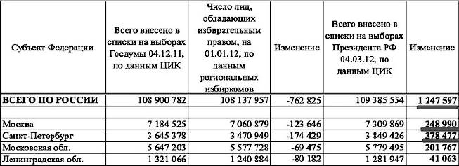 Усовершенствованная система подтасовок и фальсификации результатов голосования была задействована и в ходе президентских выборов 4 марта 2012 г., на которых вновь победил Путин. Использовав лазейку в конституции, он баллотировался на пост президента в третий раз. (Все же не подряд, а после некоторого перерыва на Медведева). Центризбирком объявил, что Путин был избран подавляющим большинством голосов уже в первом туре. Так это было на самом деле или нет, мы наверное, никогда не узнаем, а участникам кампании "За честные выборы" навряд ли удастся доказать свою правоту. Голоса подсчитаны. Итог объявлен и признан международным сообществом. Бюллетени проголосовавших выкинуты в помойку. Не хранить же их вечно. Но в России народ дотошный, любит докопаться до истины. И вот 24.05.2012 в Интернете на сайте cook.ru появляется статья "Маленькие успехи "особой химии". Она снабжена вот такой таблицей, из которой явствует (см. таблицу ниже ), что всего по России во время президентских выборов 4 марта 2012 г. появились неизвестно откуда дополнительные 1 247 597 избирателей. Ясно, что их голоса пошли в плюс Путину. Автор взял все приведенные им цифры не из каких-то секретных источников, а снял с сайта Центризбиркома (www.cikrf.ru). Проанализировав реальное число поданных за Путина голосов, сайт cook подсчитал, что в Москве, например, показатели Путина были куда ниже – не 46 % голосов, как по данным Центризбиркома, а 26–31 %.