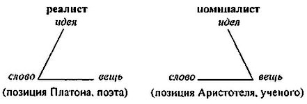 Реалист исходит из данного слова и утверждает равноценность идеи и вещи; номиналист исходит из данной вещи и утверждает равноценность идеи и слова, то есть: