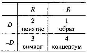 Если весьма условно выделить два взаимозависимых признака, которыми по преимуществу и руководствуется сознание, сопоставляя и оценивая вещь и идею вещи: предмет (по-научному референт R) и «предметное значение» (денотат D), предстанет четыре возможности их взаимного сочетания, согласно математическому правилу распределения двух элементов по двум признакам, с наличием (+) или отсутствием (-) таковых: