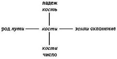 В горизонтальном ряду – соответствия по категориям, в вертикальном – по формам в парадигме склонения. Каждое сопоставление мысленно снимает с неопределенно-синкретичной формы кости какой-нибудь один грамматический смысл, всё более уточняя единственность данного конкретного значения. И тогда становится ясным, что данная в точке скрещения форма кости – не множественного числа, не именительного падежа, не мужского рода, не первого склонения, а... (и следует утверждение) перед нами имя третьего склонения, женского рода в форме родительного падежа единственного числа. Апофатическими отрицаниями в метонимической смежности форм мы получили искомый ответ и теперь уже можем воскликнуть вслед за простодушным отроком: «Ну!» – утверждая справедливость построения формы в прицеле смысла.
