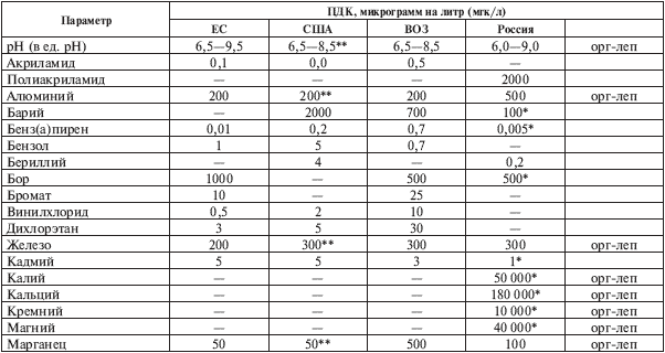 2. В таблице представлены различные группы веществ: легкие и тяжелые металлы (к последним экологи относят многие металлы, например алюминий, титан, хром, железо, никель, медь, цинк, кадмий, свинец, ртуть и др.), неорганические и органические соединения. В настоящей таблице данные обобщены и наиболее соответствуют российскому и европейскому стандартам. В нормативах США и ВОЗ органические вещества расписаны подробнее. Так, в стандарте США перечислено около тридцати видов опасной органики. Самыми детальными являются рекомендации ВОЗ, в которых есть следующие отдельные списки: неорганические вещества (в основном тяжелые металлы, нитраты и нитриты); органические вещества (около тридцати), пестициды (более сорока); вещества, применяемые для дезинфекции воды (в основном различные соединения брома и хлора – более двадцати); вещества, влияющие на вкус, цвет и запах воды. Также перечислены вещества, которые не влияют отрицательно на здоровье при предельно допустимых концентрациях в воде – к ним, в частности, относятся серебро и олово.