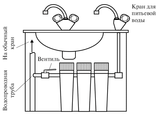 Фильтр устанавливается над мойкой и соединяется с водопроводной трубой таким образом, что можно с помощью специального вентиля пустить воду на фильтр или перекрыть ее поток. Выход очищенной воды производится по шлангу, который соединен с дополнительным краном, установленным над раковиной; таким образом, мы отключаем фильтр, когда моем посуду под основным краном, и включаем его, когда нужна очищенная питьевая вода, поступающая через дополнительный кран. Существует несколько вариантов стационарных фильтров, и основные таковы: