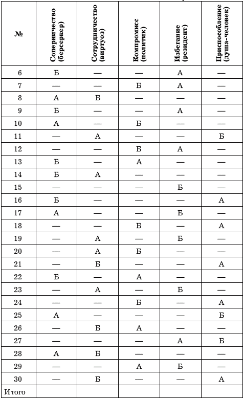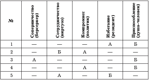 Количество баллов, набранных вами по каждой шкале (число выбранных ответов по каждому столбцу таблицы), дает представление о выраженности у вас тенденции к проявлению соответствующих форм поведения в конфликтных ситуациях.