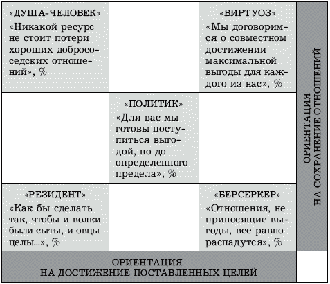 Перед вами схема, в которой даны авторские названия переговорных стратегий. Впишите в схему полученные вами процентные значения по шкалам теста по каждой стратегии и приступайте к анализу (табл. 11)