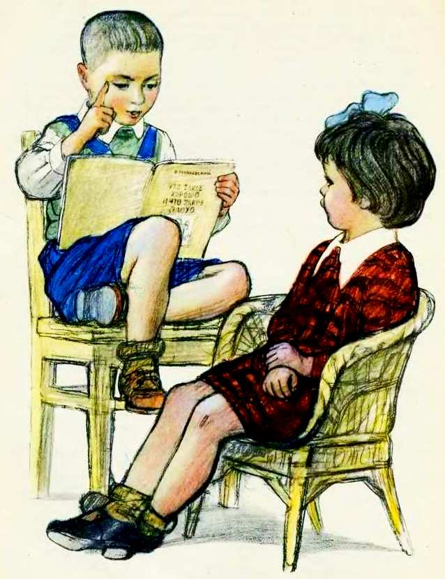 Маяковский умел серьёзно и смешно рассказывать детям о том, «Что такое хорошо и что такое плохо». Он придумывал забавные книжки-картинки, где «Что ни страница,– то слон, то львица». Он умел по-дружески разговаривать с «товарищем птицей». Он писал ребятам стихи «Про моря и про маяк».