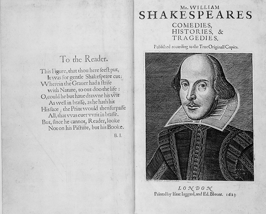 К с. 449. Друшаутский портрет У. Шекспира в Первом фолио, 1623. Автор стихотворного обращения «К читателю» (слева) Бен Джонсон