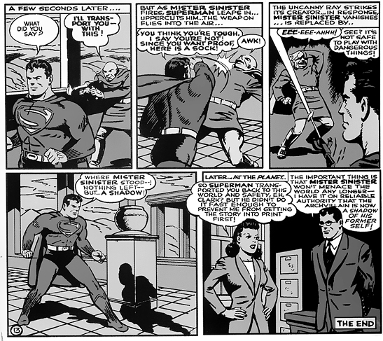 К с. 373–374. Комикс о Супермене (№ 16, 1942 г.), окончание истории мистера Синистера. В нижнем левом квадрате Супермен произносит: «Там, где стоял мистер Синистер, ничего не осталось – только… тень»