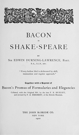 К с. 447. Титульный лист книги Э. Дернинга-Лоуренса «Бэкон это Шекспир» (1910)