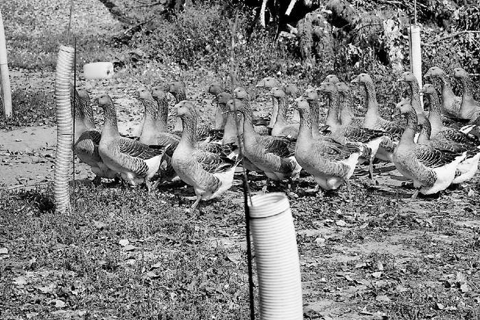 Сколько у них там гусей, я не спросил, но ходят они – хочется сказать «стадами», хотя гуси стадами не ходят. Да и вообще, в России гуси не ходят, а летают (клиньями, что ли?). Как бы там ни было, одомашненные французские гуси передвигаются гусиным шагом, словно солдаты на параде: все вместе, рядами, постоянно переговариваясь между собой и никого близко не подпуская, кроме знакомого «гусевода», который их кормит. Они его слушаются: когда он тихо начинает посвистывать, вся эта гусиная армада разворачивается и, если нет поблизости никого чужого, дружно движется к нему. Впечатление сильное.