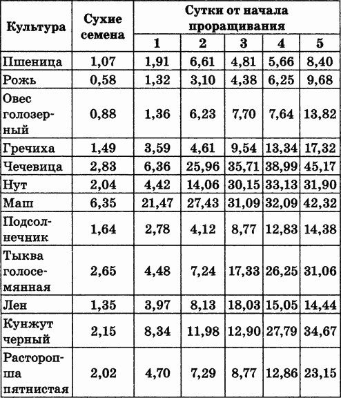 Полученные данные представлены в табл. 1. Посмотрите внимательно на строчки в этой таблице. Когда будете решать, проростки каких культур вы будете готовить для себя, эти цифры помогут вам выбрать то, что нужно.