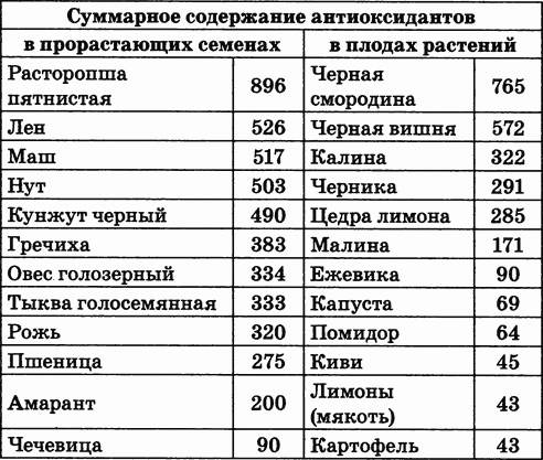 Среди пищевых продуктов, в составе которых в НТЦ «Хроматография» определяли количество антиоксидантов, были плоды культурных растений. Это дает возможность сравнить суммарное содержание водорастворимых антиоксидантов в некоторых плодах с их количеством в прорастающих семенах (см. табл. 4).