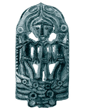 Пластина прорезная – антропоморфная фигура в окружении человеколосей. VIII–IX вв. Бронза, литье. 9,2 x 4,7 см. ЧКМ № 955/57.