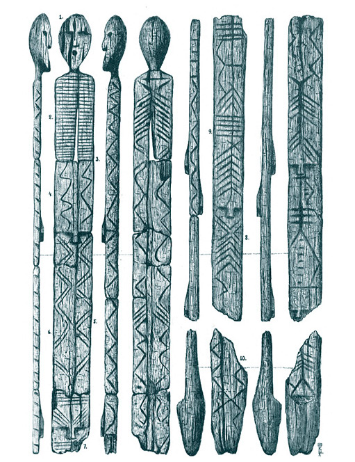Настоящие языческие идолы обнаружили археологи при раскопках уральских торфяников, где дерево хорошо сохраняется. Один такой идол был найден в Шигирском торфянике и представлял собой фигуру из лиственницы высотой 5,3 метра, увенчанную остроконечной головой. Другой идол – из Горбуновского торфяника – менее схематичен: он также вырезан из соснового ствола, скульптор снабдил его ногами, но вот рук у него нет. Что-то подобное есть в верованиях ближайших угорских народов – хантов и манси: в их мифах рассказывается о лесных великанах менквах, неудачном творении бога Нуми-Торума, – он хотел сделать людей из лиственницы, но те превратились в «недоделанных» лесных чудовищ. Сходные изображения были найдены в торфяниках другой окраины финно-угорского мира, в Прибалтике, но они относятся к мелкой пластике, а не к монументальной скульптуре.