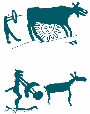 Отрисовка Анны Коноваленко (по изданиям: Мазин А. И. Писаницы бассейна р. Алдан. Новосибирск, 1979; Жульников А. М. Петроглифы Карелии: образ мира и миры образов. Петрозаводск, 2006)