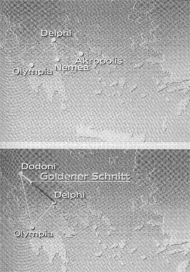В книге Эриха фон Дэникена (см. [17]) я прочитал, что священные места в Древней Греции связаны друг с другом пропорцией Золотого сечения. Цитирую мной лично проверенные данные, которые приводятся в этой книге (см. рис. 55 и 56):