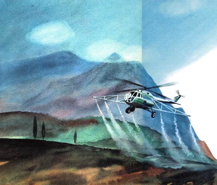 А тут вдруг агроном обнаружит, что на дальнем поле завелась прожорливая хлебная жужелица. На вертолёт ставят штанги с дырочками: две штанги с боков, третью под хвостом. Летит вертолёт, опрыскивает заражённое вредными насекомыми поле.