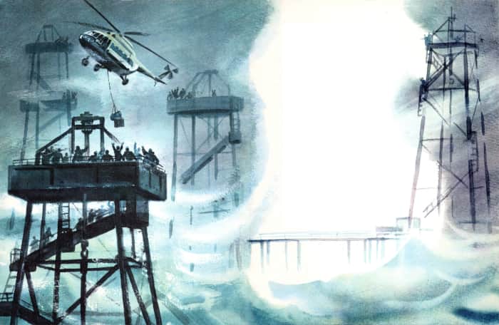 Площадки, где размещались дома буровиков, – под водой. Люди на вышках сидят, кто где. И это на ледяном ветру. Опустил я продукты на верхние площадки и улетел за одеждой. Подойти к вышкам и снять людей было невозможно, ветер разбил бы вертолёт о железо.
