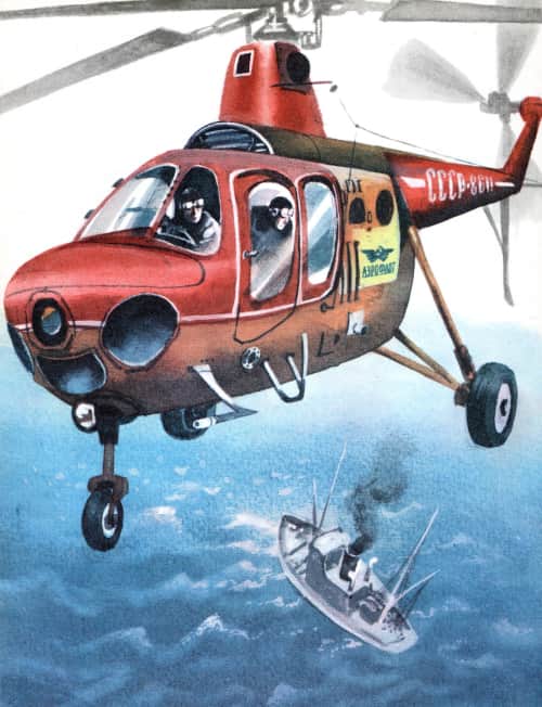 Военные вертолётчики всегда готовы прийти на помощь мирному труду. С далёкого Севера полетели мы на Украину, на завод. Рабочие сняли крышу, стан разрезали на части, а наш вертолёт поднял их и вынес с завода.