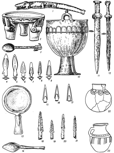 Савроматская культура: 1 – рукоять нагайки; 2 – жертвенник; 3, 14 – ложки; 4–9, 15–21 – наконечники стрел; 10 – котел; 11, 12 – мечи; 13 – зеркало; 22, 23 – керамика (1 – рог; 2 – камень; 3, 14 – кость; 4–9, 13, 15–17 – бронза; 10 – медь; 11, 12, 18–21 – железо)