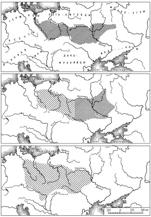 Если мы обратимся к «языку земли», то увидим, что почти по всей территории распространения культуры полей погребальных урн господствует славянская топонимика. На всем пространстве от Поморья, Лужиц, Силезии до Заднепровья и Полесья, от низовьев Вислы до Карпат и даже Закарпатской низменности тянутся земли, по которым текут Десна и Припять, Березина и Тетерев, Бобр и Вепрь, где такие наименования, как Болотница, Бродница, Гнилая, Добра, Ельня, Комар, Яблоница, Быстрица, Лозница и т. п., встречаются повсеместно.