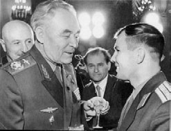 Главный маршал авиации К. А. Вершинин приветствует героя-космонавта