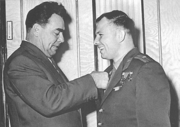 Л. И. Брежнев вручает Юрию Гагарину знак летчика-космонавта СССР. 14 апреля 1961 г.