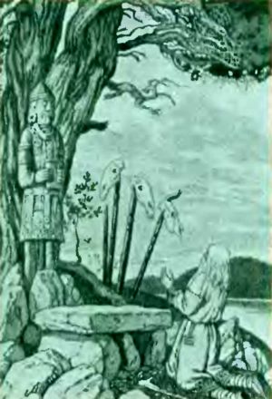 Самый большой храм стоял внутри двора, но вместо стен ему служили пурпурные завесы, крыша же опиралась лишь на колонны. Служители, разломав ограду двора, взялись за внутренние завесы храма. Когда и их убрали, высеченное из дуба изваяние, именовавшееся Ругевитом, стало видно в своем уродстве со всех сторон. Ласточки, которые под его устами свили гнезда, покрыли пометом его грудь. Достойный бог, изображение которого столь уродливо измарано птицами! Кроме того, у его головы было семь человекоподобных лиц, которые все были покрыты одним черепом. Столько же мечей в ножнах, подвешенных к его боку, изобразил мастер. Восьмой, обнаженный меч бог держал в руке; он был крепчайше прибит железным гвоздем, так что нельзя было извлечь, не разрубив, что показало его рассечение. Ширина его была больше человеческого роста, высота же такая, что епископ Абсалон, встав на цыпочки, едва достал до подбородка топориком. Этого бога почитали, совсем как Марса, возглавляющим силы войны. Ничего забавного не было в этом изваянии, вызывавшем отвращение грубыми чертами уродливой резьбы».