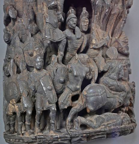 Оборона цитадели, резьба по дереву, Египет, V в. Римские воины на рельефе носят кольчуги с длинным подолом и рукавами до локтя, шлемы с волосяным султаном и круглые щиты. Изображения на щитах напоминают миниатюры из Notitia Dignitatum. Нападающими являются всадники в доспехах, возможно, персы: