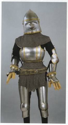 Это дорогой доспех – обратите внимание на золотую отделку. Минимум втрое дороже обычного. Считается что он неполные – латные пальцы граф Ульрих IV Матш дескать потерял или пропил. Или не он, но судя по ехидному забралу шлема – мог и он. Кстати, шлемяра весит 5,7 кг с камэлькой – это не типично. Обычно он весит в пределах трех. Видимо эти доспехи, произведенные в Милане в период 1370–1390 гг., делались с учетом пожеланий заказчика.