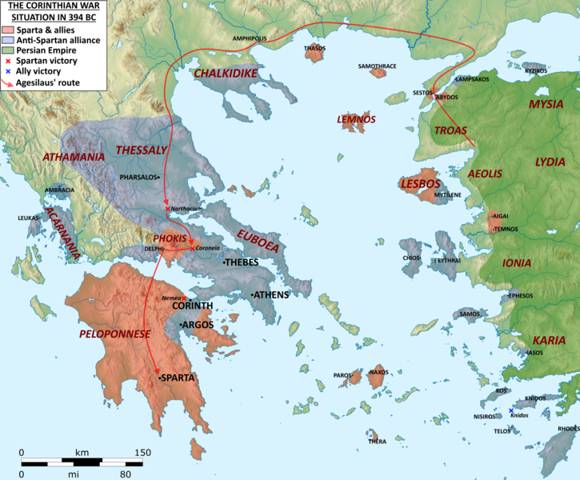 Остальные в армии Спарты– наёмники и союзники, около шести тысяч. С такими силами Агесилай смог захватить ионическое побережье и множество городов. Собрать, уже на месте, в Азии, армию побольше. Даже разбить под Сардами сатрапа Персидской Империи.
