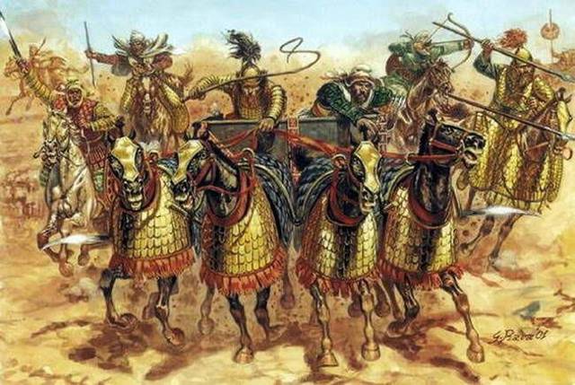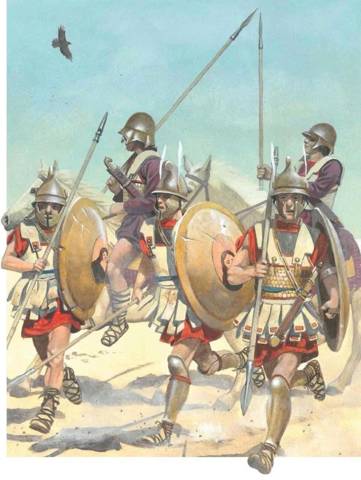 6. Непонятен боевой прием тяжелой пехоты против колесниц с косами – расступиться перед колесницами. Практичнее было встретить их на длинные копья, уперев обух копий в землю.