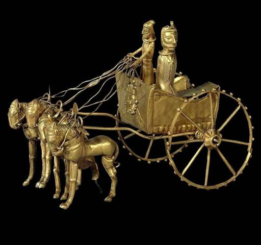 Ну ладно, портретное сходство это одно, а детали вооружения и оснащения воинов другое. Вот, например, типичное изображение персидской «квадриги», это когда четыре лошадки. Эта конкретная золотая колесница найдена на территории совр. Таджикистана, 5−4 вв. до н. э. В ту эпоху данные земли как раз входили в состав Персии Ахеменидов (550−329 гг. до н. э.).