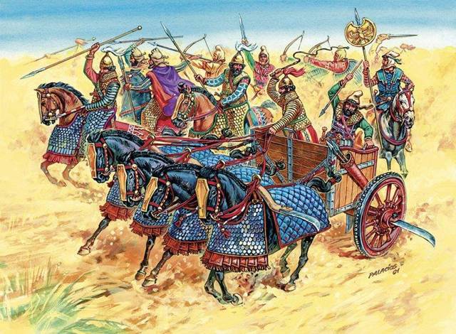 Зато все трое довольно подробно останавливаются на серпоносных колесницах. Логично думать, что сами древние греки уделяли им много внимания. И важность этого момента подчеркивается тем, что все трое говорят о серпоносных колесницах, а не про слонов, которых Дарий выписал из Индии. Хотя на мой, любительский, взгляд, слон как-то по представительней.