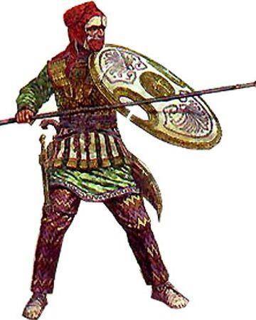 А вот легкую персидскую пехоту из племен, греки наверняка частью вырезали, частью собрали в плен. На картинке ниже, кстати, совсем не персы, а расово верные пеонийцы, близкие родственники македонцев, только малость более горные. Племя этих конкретных называлось агриане. Тут они потому, что похоже спасли ситуацию, не дав злым сакам затопить Александра волнами своих бесчисленных тел. И вообще, в источниках они довольно часто мелькают. Своеобразная гвардия пельтастов.