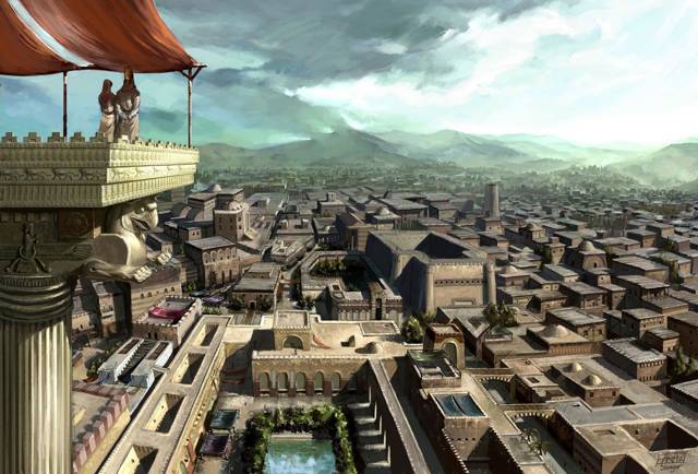 Реконструкции вырваны из контекста, поэтому не дают нужного впечатления. Я нашел не очень историчный, но очень атмосферный арт, который отражает то, как выглядела цивилизация Месопотамии. Вот такие панорамы могли видеть греки в Персии. Город до горизонта – это, наверное, просто ломало шаблон.