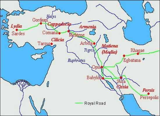 В 5 веке до нашей эры по приказу персидского царя Дария I была построена мощеная дорога, соединившая западные и восточные сатрапии бескрайней Державы Ахеменидов и получившая название «Царская дорога». Впервые о ней рассказывает древнегреческий историк Геродот, восхищаясь устройством почтовой службы у персов и скоростью, с которой передвигались по этой дороге царские гонцы. Из описаний Геродота следует, что на всем протяжении Царской дороги на расстоянии дневного пути друг от друга стояли пункты, где один посыльный передавал важные данные другому, и таким образом гонцы экономили силы своих лошадей и обеспечивали максимально быструю передачу информации. Начиналась Царская дорога в городе Сарды на западе Малой Азии и уходила далеко на восток, связывая важнейшие политико-экономические центры государства Ахеменидов. Доходя до района современного Мосула в Ираке, дорога разделялась на две ветви, одна из которых через Экбатаны направляла путников к Великому Шелковому пути, а другая уходила в юго-восточном направлении в сторону Суз и Персеполя. Судя по всему, при строительстве Царской дороги были использованы участки более древних мощеных магистралей, проложенных ассирийцами и вавилонянами. Для ее восточного продолжения основой послужили западные участки Великого Шелкового пути. Царская дорога поспособствовала расцвету торговли в государстве персов, продолжавшемуся вплоть до похода Александра Македонского. Отличаясь высочайшим качеством, эта дорога частично использовалась еще во времена Рима и Византии. В одном из турецких городов до сих пор сохранился мост, являвшийся частью Царской дороги и перестроенный римлянами.