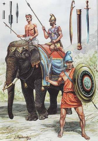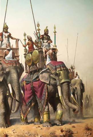 Судя по всему слоны использовались в первую очередь как возвышающиеся над полем битвы платформы, с которых велся обстрел врага, но сами они были весьма уязвимы – их всегда прикрывали конницей и легкой пехотой.