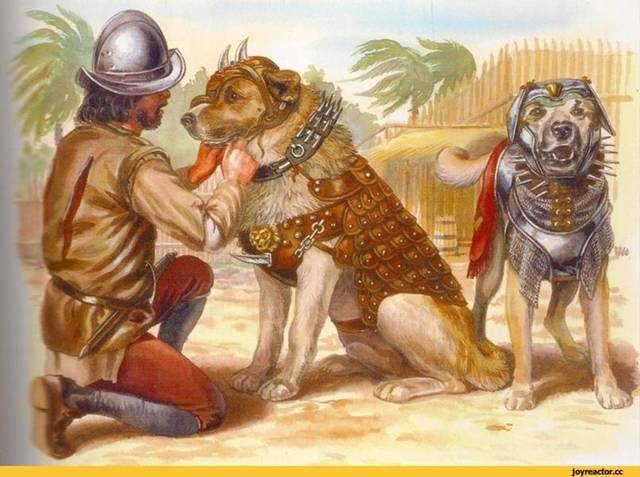 По видимому, именно боевые, не охотничьи, псы, все произошли откуда-то из тибета. Прямые потомки боевых псов – мастифы. Если конкретнее – молоссы. В источниках утверждается, что некоторые представители боевых псов достигали веса в сто килограмм, при этом шестьдесят килограмм было нормой. Они получили быстрое распространение, в античности и сохранялись в промышленных масштабах до сравнительно недавнего времени. В средневековье есть упоминание о «битве псов», когда собаки противоборствующих армий дали друг другу правильное сражение. Английский король прислал союзникам на континенте подкрепление в 4 000 боевых собак – и это не было воспринято как некая причуда. Конкистадоры прямо говорят, что в завоевании Нового Света собачки им не только помогли, но буквально затащили, истребляя индейцев сотнями. Короче в средневековье собаки были практически полноценными участниками боевых действий.