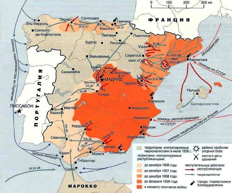 Помогали в основном мятежникам. Республиканцам, сильнее всего, конечно, помог Хемингуэй, написав роман «По ком звонит колокол». В СССР этот роман перевели только в 1962, снабдив в предисловии таким примечанием: «…встречается ряд моментов, с которыми трудно согласиться. Так, например, обращает на себя внимание не совсем правильная трактовка образов коммунистов, бесстрашных и мужественных борцов с фашизмом в трудное для испанского народа время».