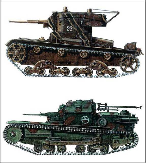 Наверху танк Т-26 республиканской армии. Окраска нестандартная. Каталония. Это, правда уже 1938 г. Внизу танкетка «Фиат – Ансальдо» СV–3/35. Барселона. Она 1939 года, но надо сказать, что за всю войну итальянцы так и не посчитали нужным её модернизировать. Видимо, она и так совершенна.