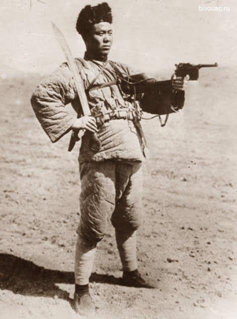 Существовали подразделения с дадао (название на китайском – дадао дуй, поэтому генерал Сун в моей голове всегда курит, когда думает план) и в Национально-освободительной армии Китая (коммунисты). На фото ниже боец отряда «Больших клинков» НОАК с изогнутым большим мечом дао (дадао) и 7,63 мм Маузером C-96 китайского производства. Ну, не нашел я фотку с большим маузером, сорян.