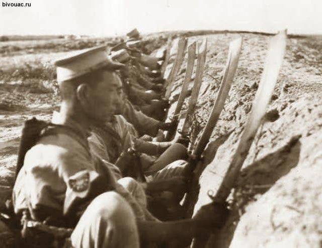 Выше солдаты одного из подразделений дадао дуй, той самой 29-й армии. Фото вроде постановочное, хоть парни и в окопе. И сидят они там с обнаженными большими изогнутыми мечами дао (дадао). На фото не видны подсумки для обойм с патронами 45-го калибра к пистолетам Шаньси тип 17, да и вообще другого оружия.