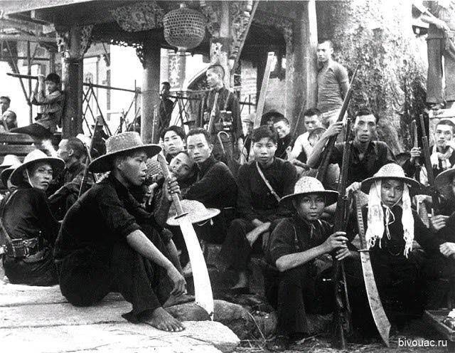Китайские партизаны вооруженные винтовками и изогнутыми большими мечами дао (дадао) в окрестностях города Гуанчжоу, 1941 год.