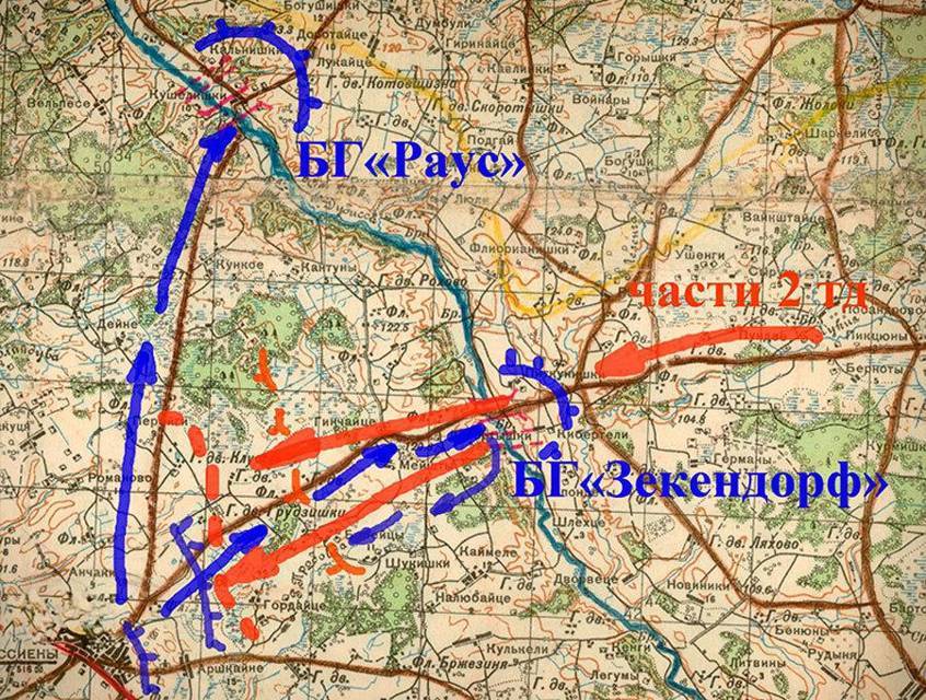 Немцы прошли городок Расейняй, и захватили мост через глубокую речку. Вернее, мосты, двумя боевыми группами. Захватили плацдармы и стали окапываться, ожидая подхода из глубины сменщиков, чтобы идти дальше. В этот момент из лесу вылезли огромные русские танки и как давай реветь как медведь. Сначала было немного страшно, но потом бравые панцергренадеры всех русских поубивали и дальше поехали.