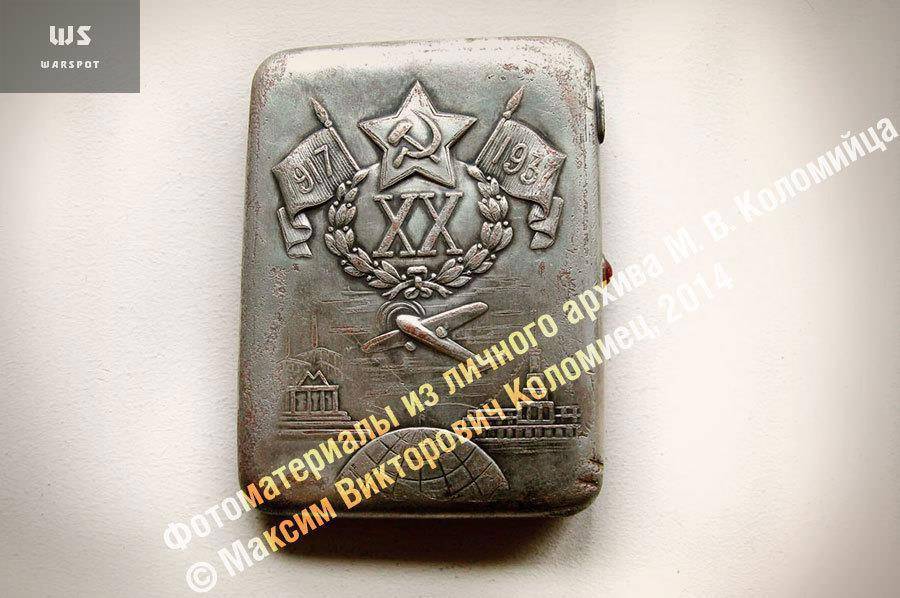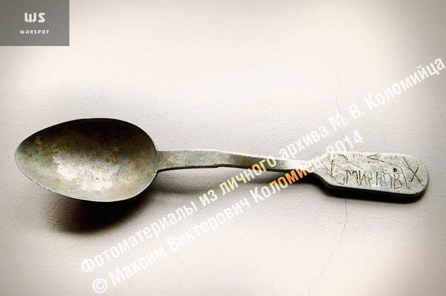 Что интересно и непонятно – было в танке 6 человек. А как известно экипаж у КВ – пять. Найдено было две ручки, два командирских ремня, две ложки и портсигар. Вот одна из этих ложек, кстати, здесь написано Смирнов В. А.