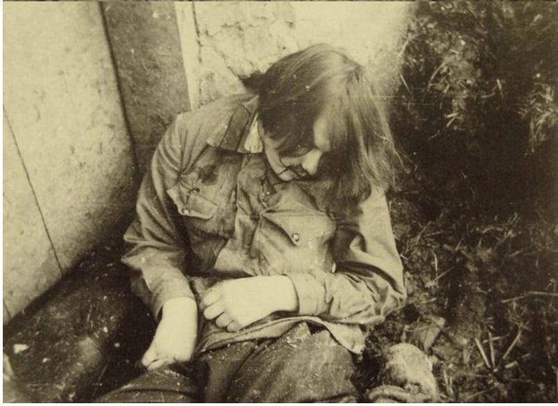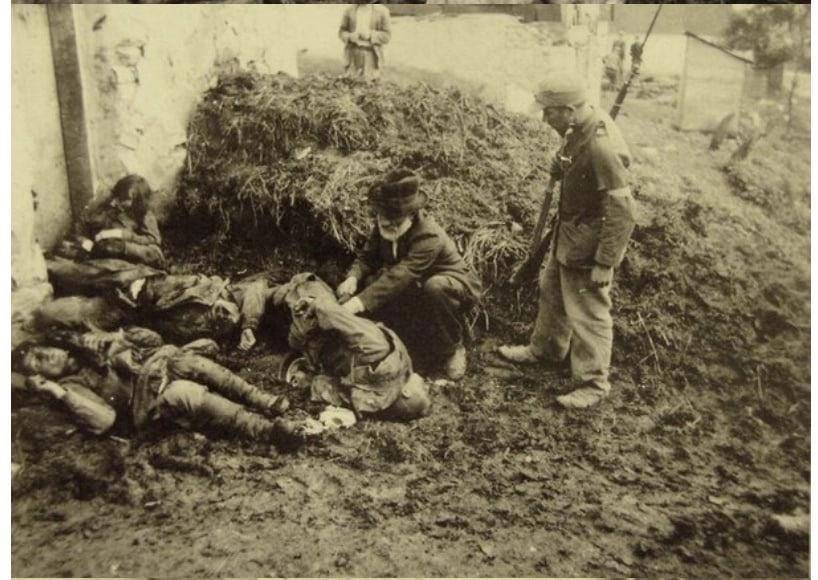 Но это ей не помогло. Я не буду смаковать подробности и выкладывать такие фотки – я человек очень впечатлительный, как прочту что-то про немецкие «художества», потом по 12 часов сплю три дня, ни строчки написать не могу. Так на меня стресс влияет. Смаковать не могу. Но отмечу – по композиции видно, что фотограф явно снимал еврея в национальной одежде. Немца забавляет больше всего еврей. А мертвые советские пленные, среди которых молоденькая девушка (судя по расположению тел, бойцы в последний момент её пытались закрыть собой) немца вообще не трогают. Для него это буквально обычные декорации для фото.