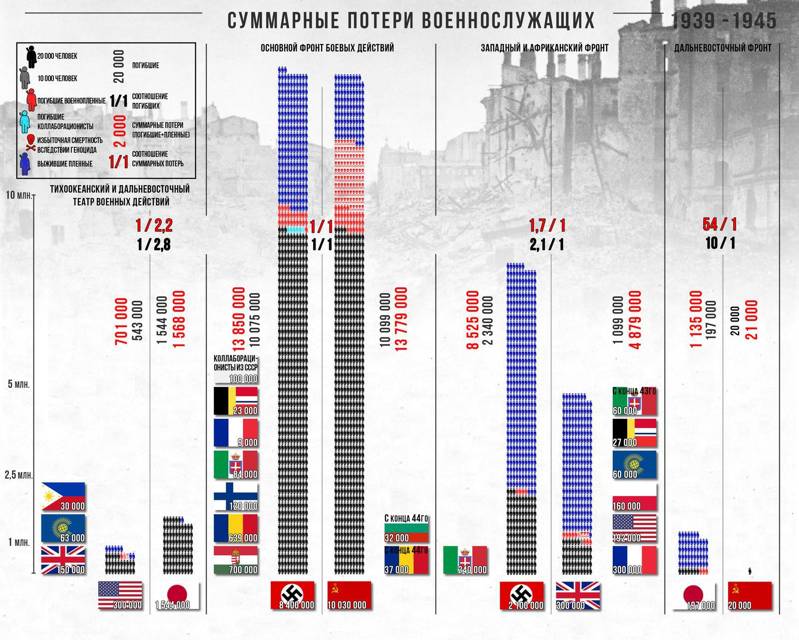 По потерям в Великой Отечественной Войне есть единственная мощная работа под руководством Кривошеева, сделанная еще в 1993-м году. Подробнее можно почитать на той же википедии, но я приведу инфографику – мне кажется она нагляднее: