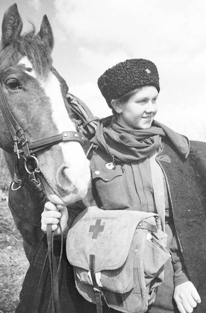На фото фельдшер пункта медпомощи 50-го Гвардейского кавалерийского полка 13-й Гвардейской кавалерийской дивизии 6-го Гвардейского кавалерийского корпуса Раиса Максимовна Балясникова. Фото 1943 г.